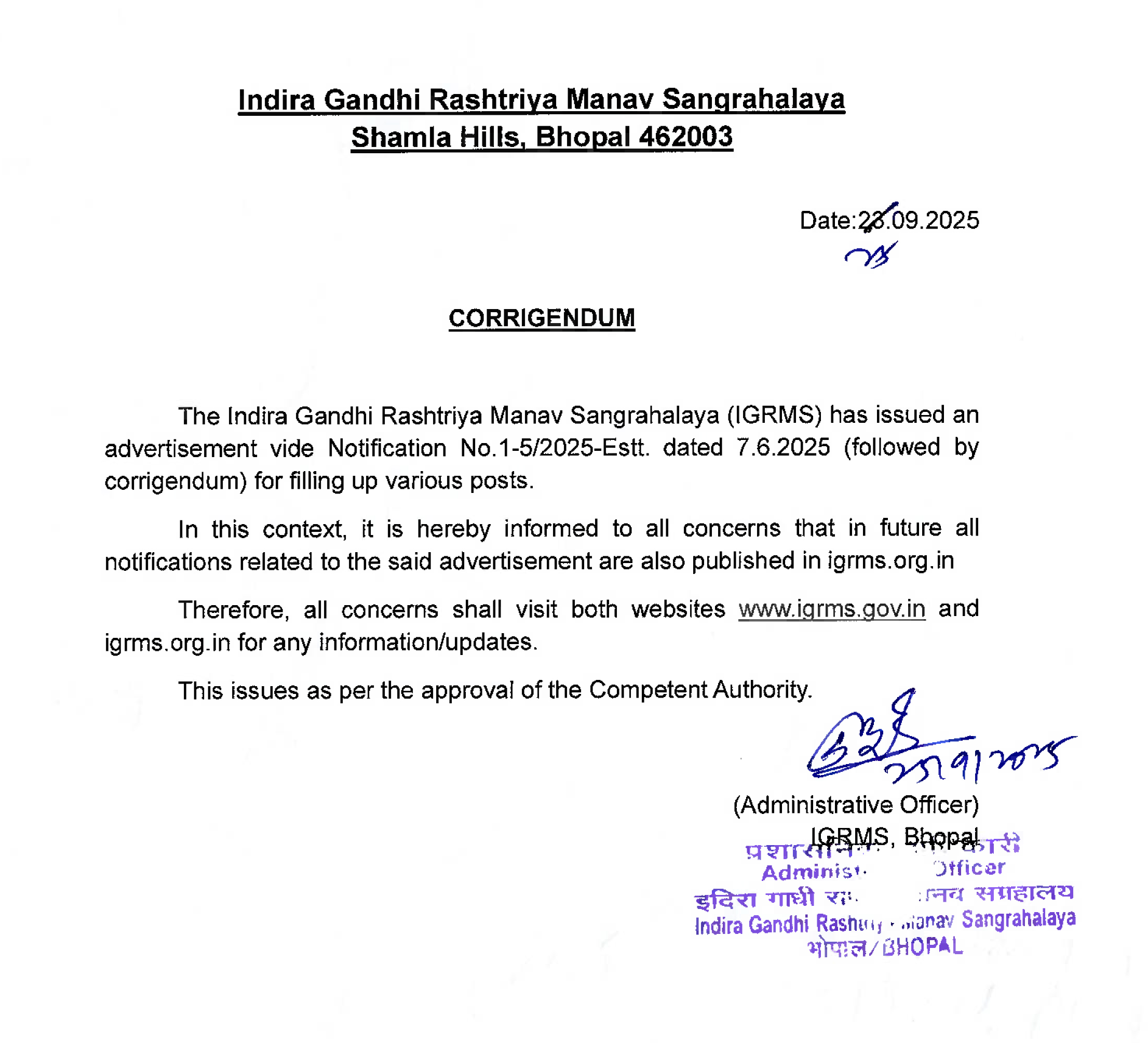 The Indira Gandhi National Museum of Man invited applications from eligible candidates to fill various vacancies through Advertisement No. 1-5/2025-Estt., dated 7.6.2025 (published in Employment News, issue dated 7–13 June 2025 (Followed by Corrigendum).