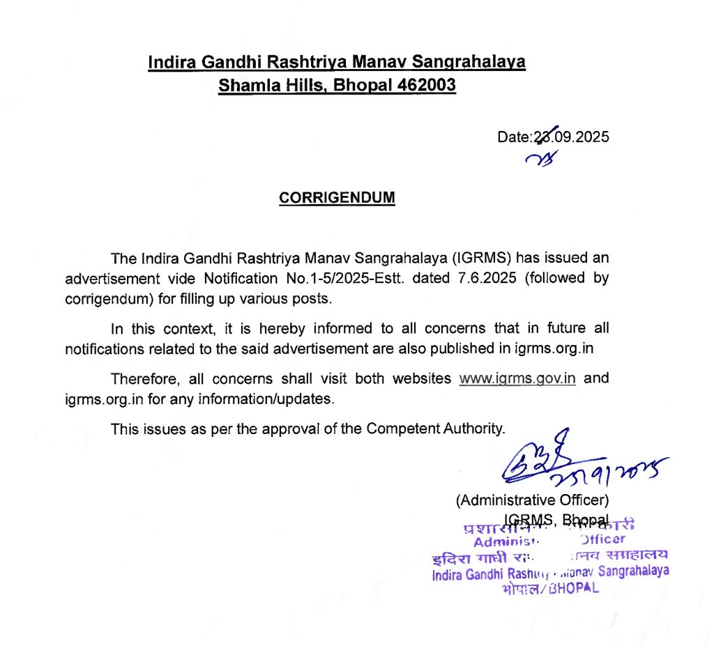 रोजगार समाचार/रोजगार समाचार दिनांक 7-13 जून, 2025 और IGRMS वेबसाइट में प्रकाशित पदों के लिए शुद्धिपत्र जारी किया जाता है: